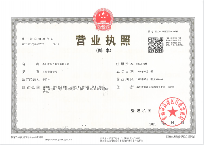 公司專業(yè)從事紡織業(yè)生產已三十多年,已成為一家從紡絲、織造、后整理到后加工一條龍的企業(yè)。公司位于江蘇省泰州市高港區大泗工業(yè)園區,交通方便,占地100余畝,擁有現代化標準廠房,現有員工120人,年產過濾布300萬米、除塵布袋600萬米、縫包線、長絲線4...